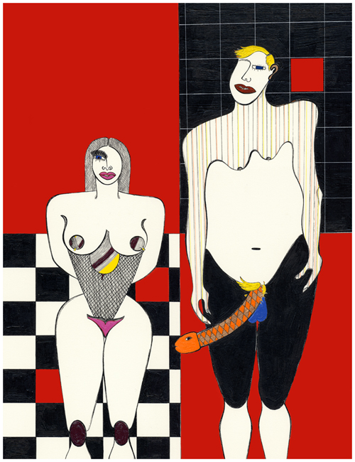 Acrylic and ink on bristle board
